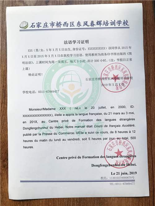 目前上海部分中介已经要求学生在开具法语学时证明时,要复印机构的办学许可证。石家庄哪些法语机构可以出具法语学习证明呢,石家庄桥西区东风春辉培训学校是正规备案、认可的法语机构,可以开具正规的法语学时证明。