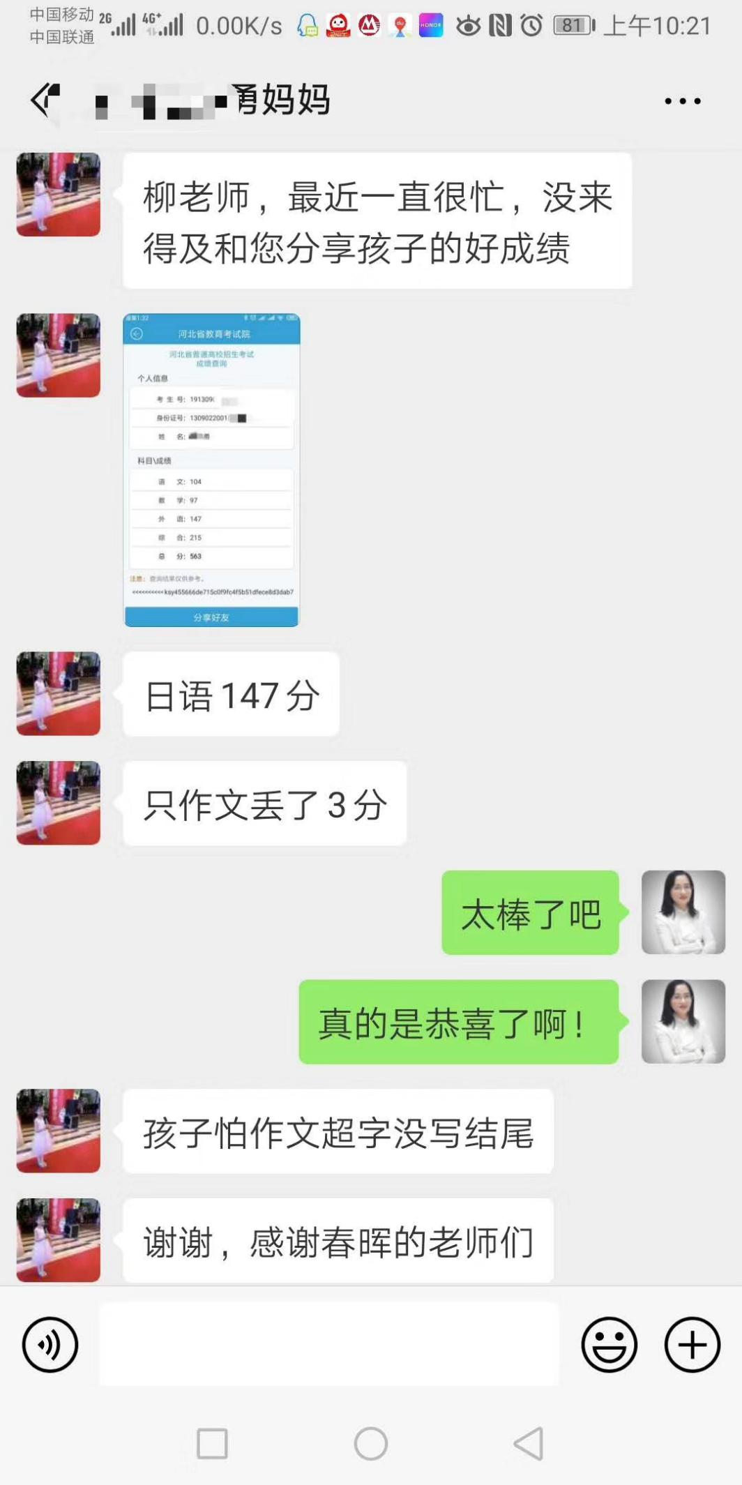 第二:学习有自制力,自学能力强,有规划,刻苦。在高二暑期坚持一个月的高考日语集中培训,由于高三复习时间紧张,加上在沧州上学,无法继续参加石家庄高考日语线下辅导,郑同学依然坚持自学高考日语,最终取得了147分的好成绩。