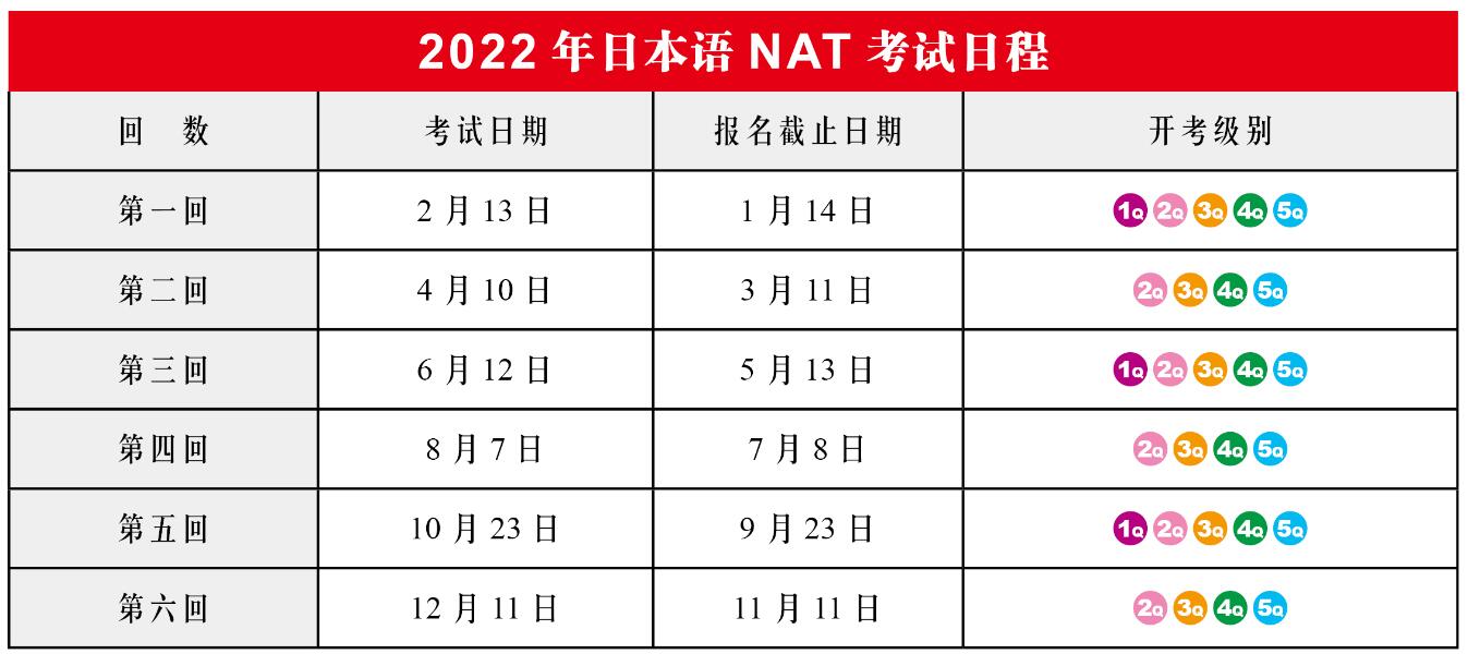2022年日语NAT考试安排: