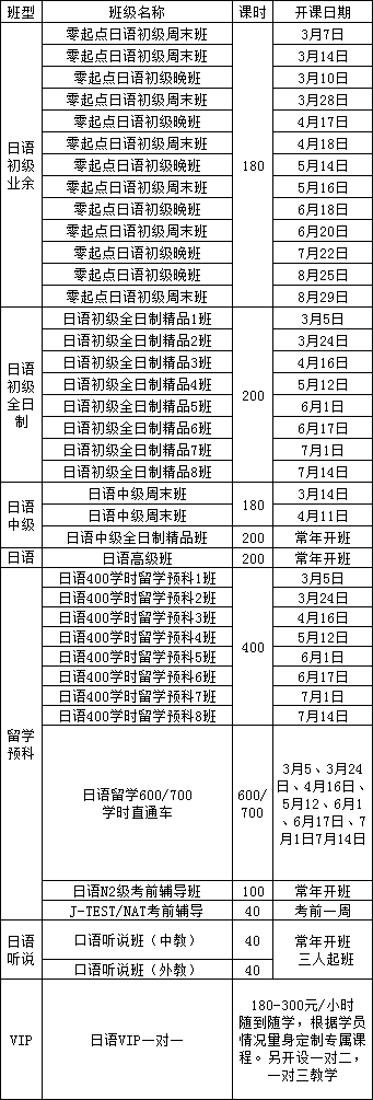 招生对象:具备400学时左右的日语学习经历或者已通过日语N2级考试计划深入学习日语参加日语N1级考试的学员。课程根据一级考试特点,在单词、听力、文法、读解四方面针对学生的弱项,逐步提高;整理复习一级文法的接续区别,读解重点和听力技巧;针对能力考试强化训练,短时间内提高综合运用能力及一级应试能力,让学员在已有的日语中级的基础上,强化训练,达到通过一级考试的能力。开课时间见下表: