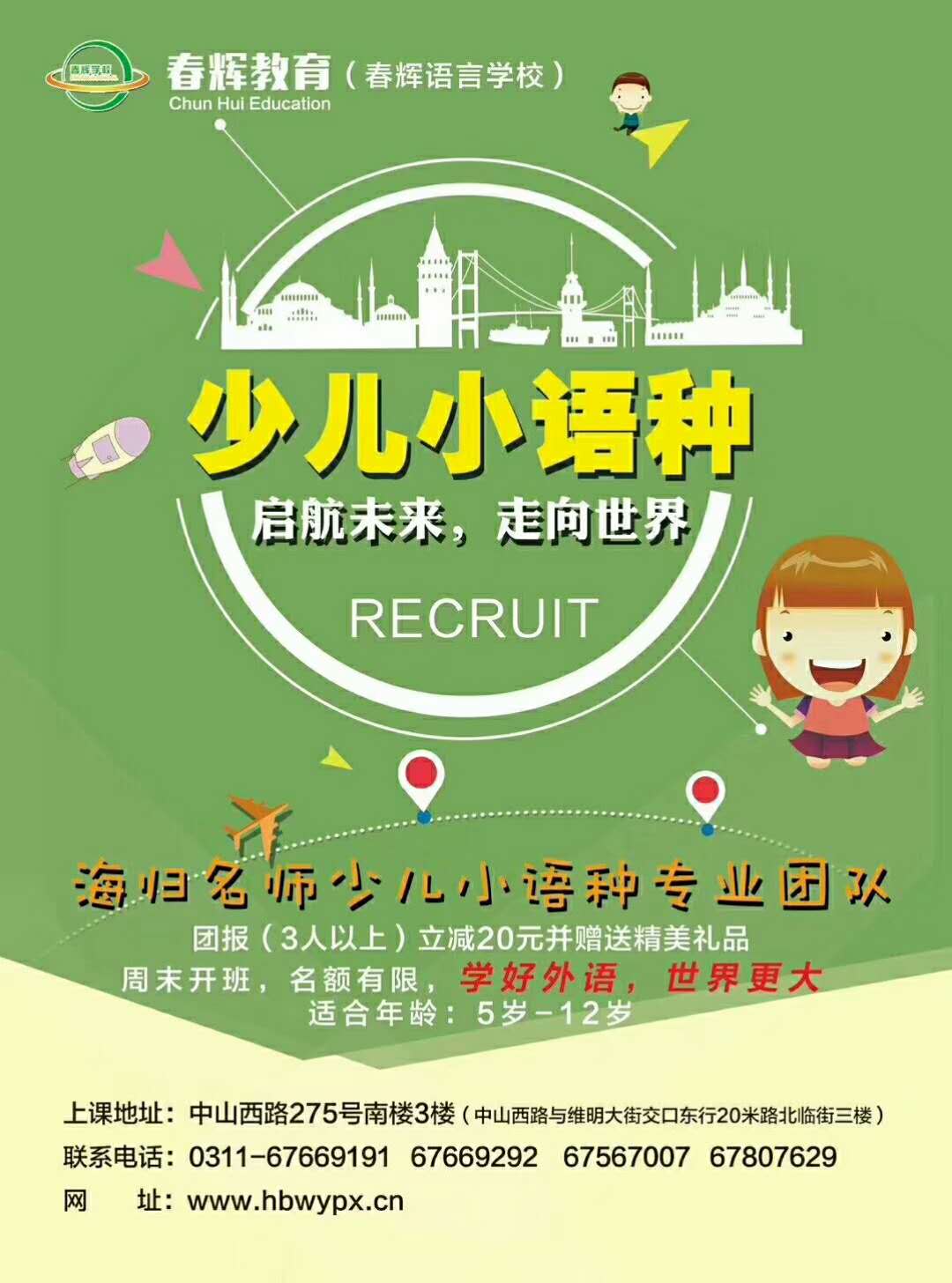 很多家长都是望子成龙、望女成凤,希望自己的孩子“赢在起跑线上”。现在想要赢在起跑线上,不只是靠英语,西班牙语更是成为孩子起步的助力器!春辉学校少儿西班牙语课堂面对5-12岁儿童开课,为孩子们提供一个轻松快乐的学习氛围,常年开班,欢迎有意者前来咨询报名!来电可预约免费试听课!