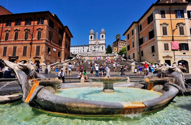 在《罗马假日》中,赫本就坐在喷泉旁的台阶上吃着冰淇淋。很多游客都站在喷泉的位置拿着相机往上拍摄,这样就能拍到西班牙台阶和圣三教堂的全景。