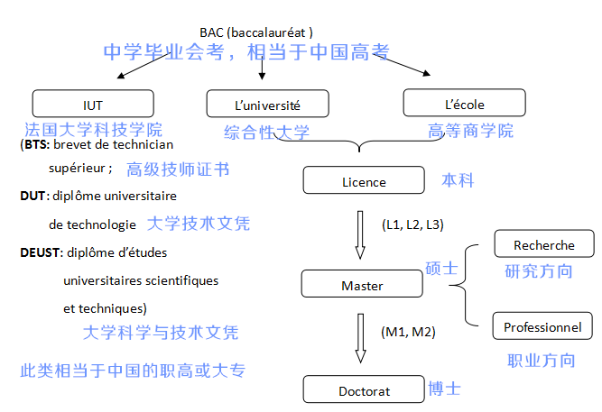 法国的高等教育分长期和短期。短期为2年,偏重于实用技术,相当于中国的大专。长期为2年以上,相当于中国的大学。